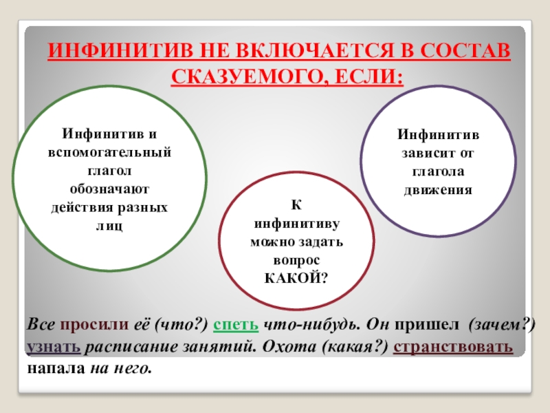 Все просили её (что?) спеть что-нибудь. Он пришел (зачем?) узнать расписание занятий. Охота (какая?) странствовать напала на него.