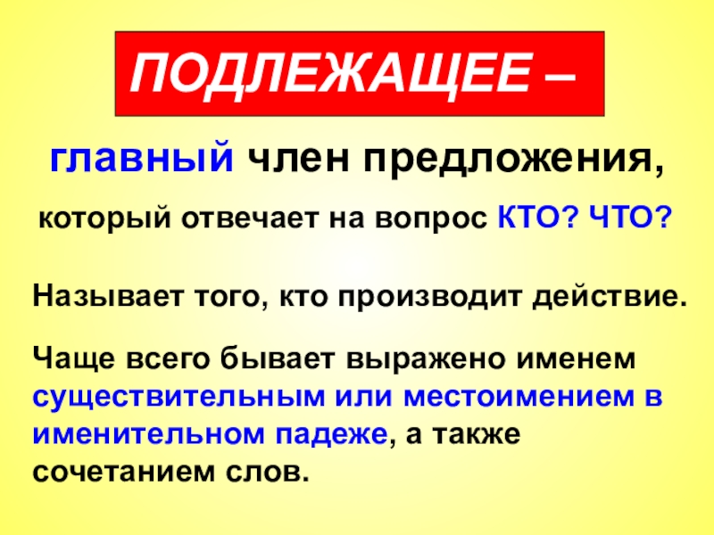 Чаще всего бывает выражено именем существительным или местоимением в именительном падеже, а также сочетанием слов.