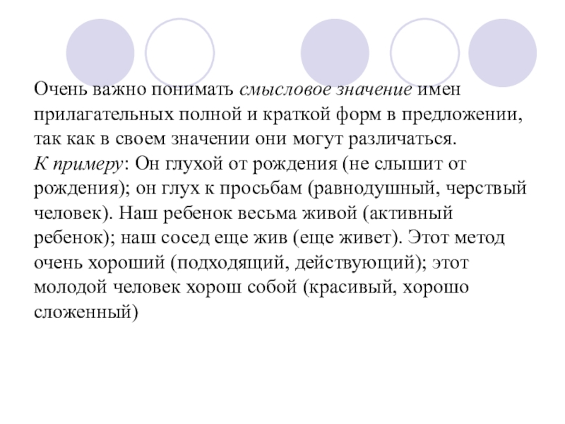 Слайд 9Очень важно понимать смысловое значение имен прилагательных полной и краткой форм в предложении,