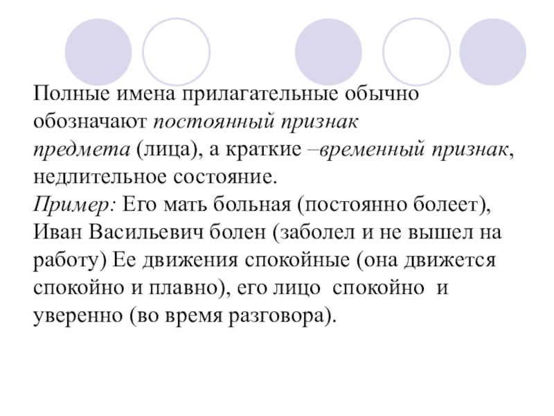 Слайд 10Полные имена прилагательные обычно обозначают постоянный признак предмета (лица), а краткие –временный признак,