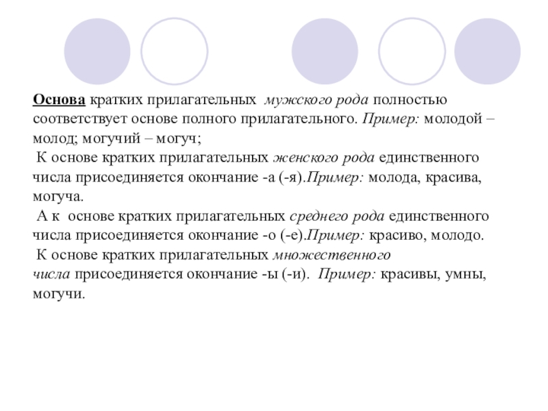 Слайд 6Основа кратких прилагательных мужского рода полностью соответствует основе полного прилагательного. Пример: молодой –