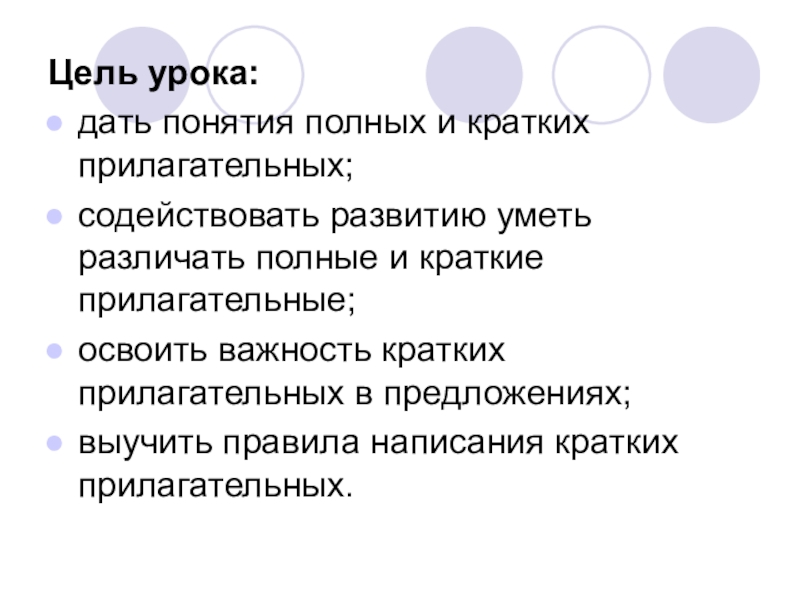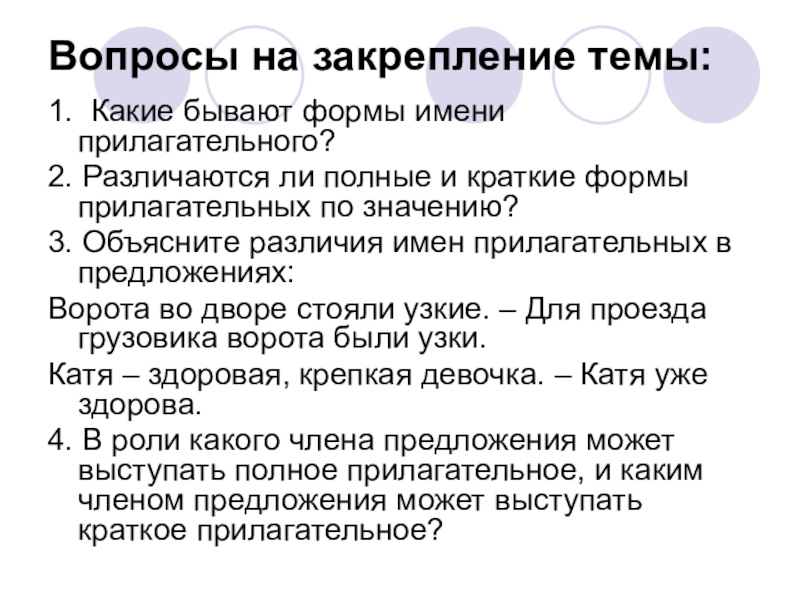 Краткие прилагательные отвечают на вопросы «каков?», «какова?», «каково?», «каковы?». Краткие прилагательные не изменяются по падежам и изменяются по родам (в единственном числе) и числам