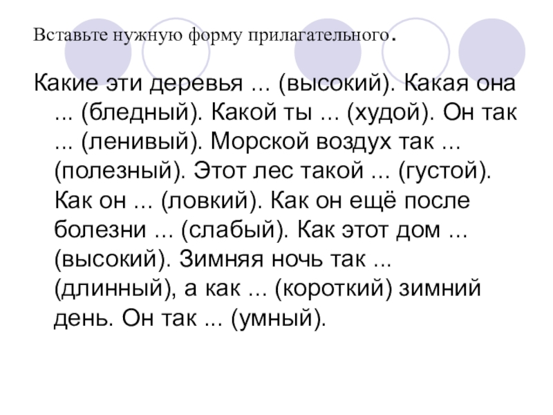 ... (бледный). Какой ты ... (худой). Он так ... (ленивый). Морской воздух так ... (полезный). Этот лес такой ... (густой). Как он ... (ловкий). Как он ещё после болезни ... (слабый). Как этот дом ... (высокий). Зимняя ночь так ... (длинный), а как ... (короткий) зимний день. Он так ... (умный).
