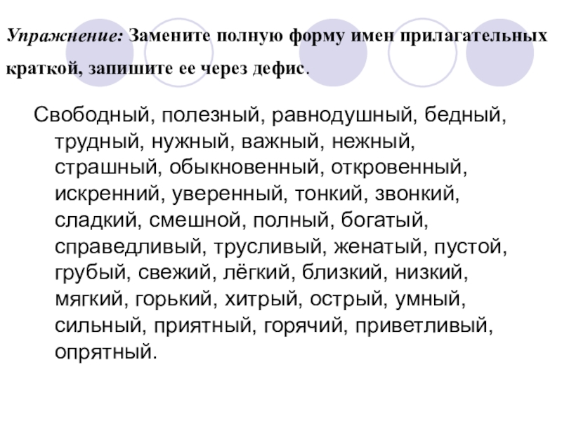 Слайд 4Упражнение: Замените полную форму имен прилагательных краткой, запишите ее через дефис.