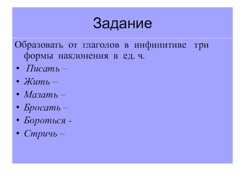 ЗаданиеОбразовать от глаголов в инфинитиве  три формы наклонения в ед. ч. Писать – Жить – Мазать
