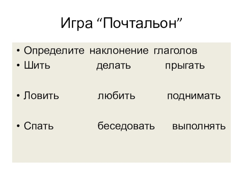 Игра “Почтальон”Определите наклонение глаголовШить          делать