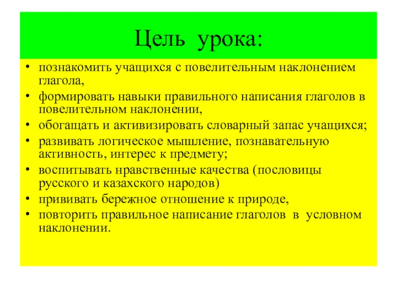 Цель урока:познакомить учащихся с повелительным наклонением глагола,формировать навыки правильного написания глаголов в повелительном наклонении,обогащать и активизировать словарный запас учащихся;развивать логическое мышление, познавательную активность, интерес к предмету;воспитывать нравственные качества (пословицы русского и казахского народов)прививать бережное отношение к