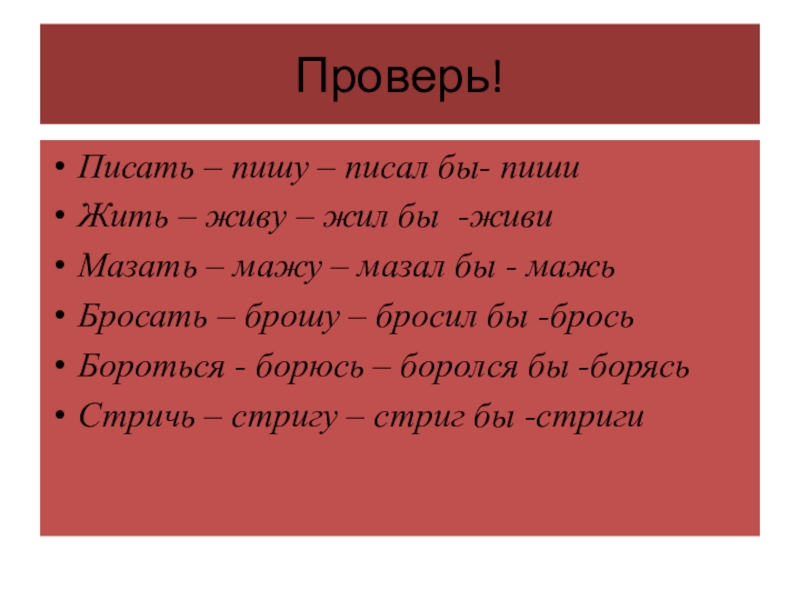 Проверь!Писать – пишу – писал бы- пиши  Жить – живу – жил бы -живи Мазать –