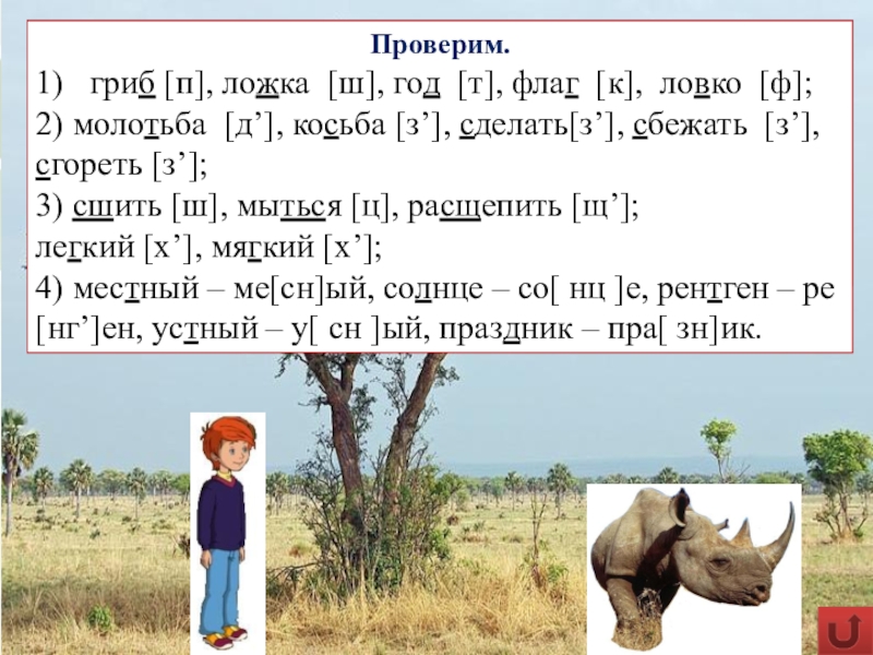 1) гриб [п], ложка [ш], год [т], флаг [к], ловко [ф];