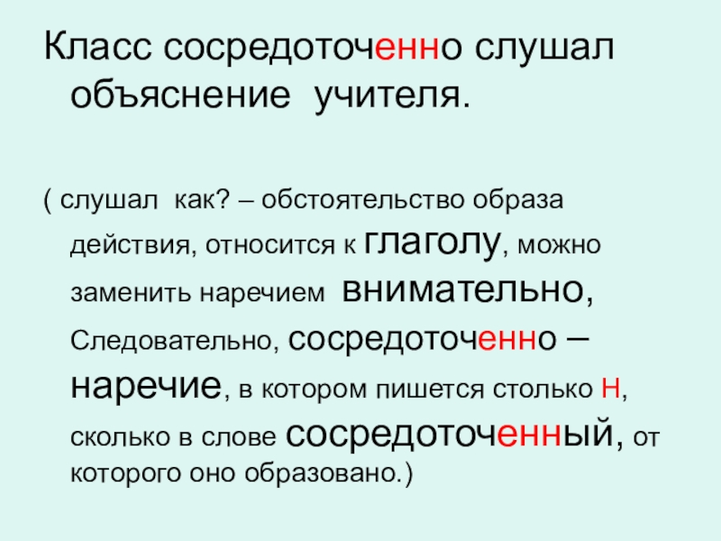 относится к глаголу, можно заменить наречием внимательно, Следовательно, сосредоточенно – наречие, в котором пишется столько Н, сколько в слове сосредоточенный, от которого оно образовано.)