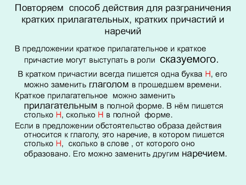 Слайд 14Повторяем способ действия для разграничения кратких прилагательных, кратких причастий и наречий