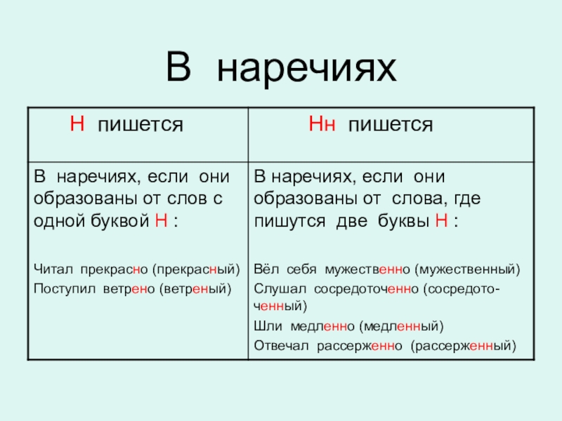Если в предложении обстоятельство образа действия относится к глаголу, это наречие, в котором пишется столько Н, сколько в слове , от которого оно образовано. Его можно заменить другим наречием.