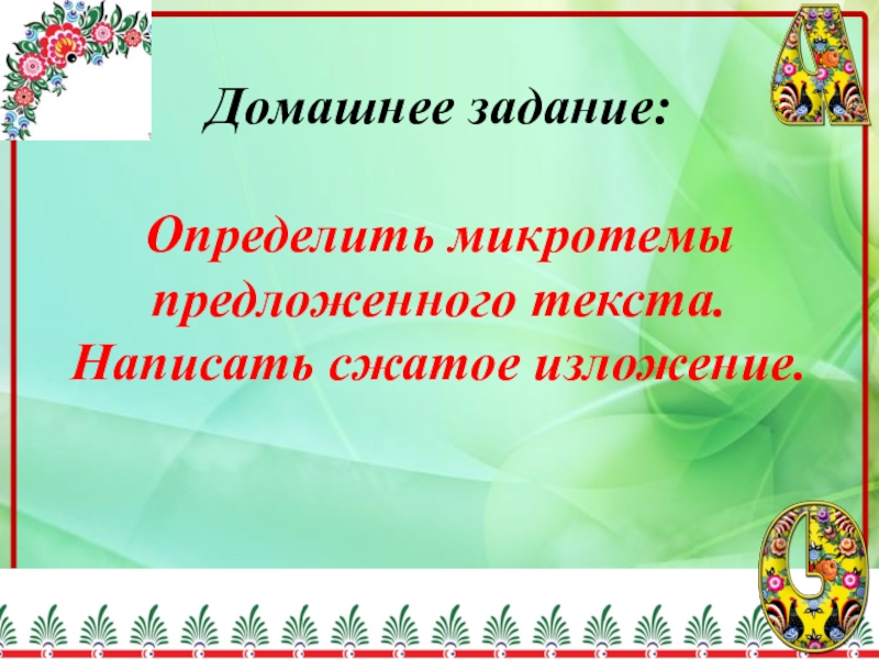 Домашнее задание:  Определить микротемы предложенного текста. Написать сжатое изложение.
