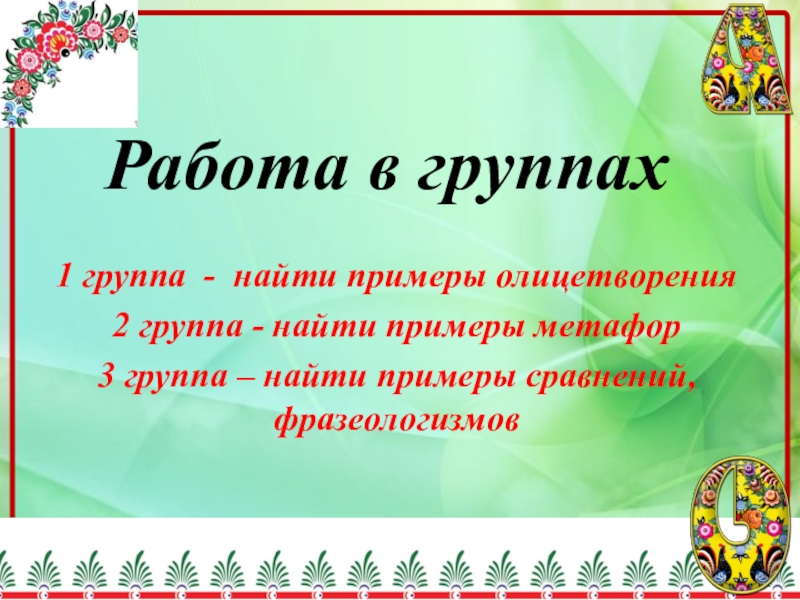 Работа в группах1 группа - найти примеры олицетворения2 группа - найти примеры метафор3 группа – найти примеры