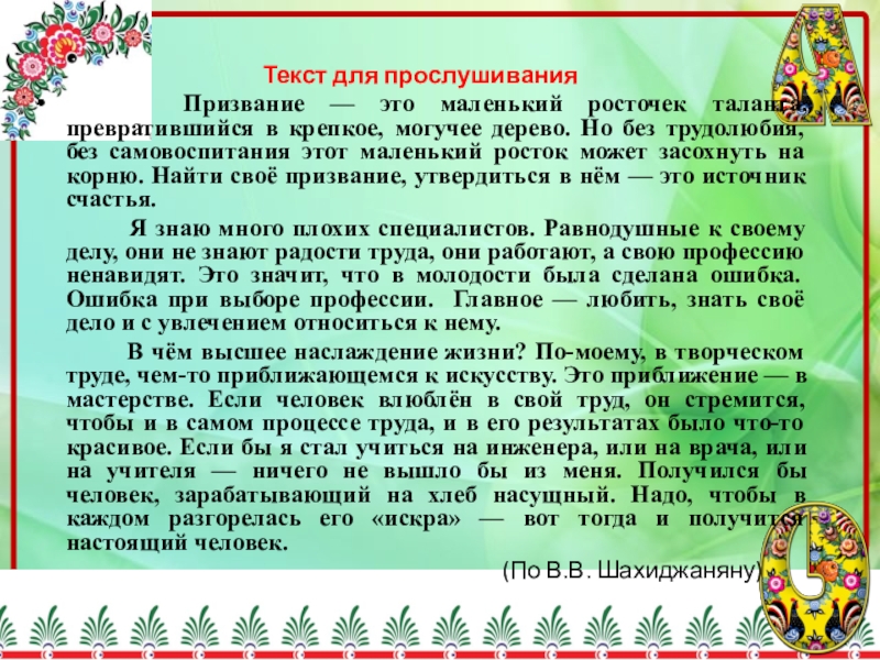 Текст для прослушивания   Призвание — это маленький росточек таланта, превратившийся в крепкое, могучее дерево. Но