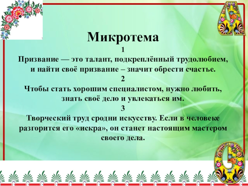 Слайд 11 Микротема 1 Призвание — это талант, подкреплённый трудолюбием, и найти своё призвание –