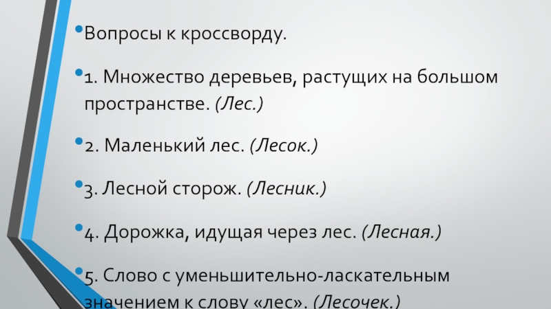 Вопросы к кроссворду.1. Множество деревьев, растущих на большом пространстве. (Лес.)2. Маленький лес. (Лесок.)3. Лесной сторож. (Лесник.)4. Дорожка,