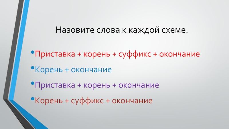Назовите слова к каждой схеме.Приставка + корень + суффикс + окончание	Корень + окончаниеПриставка + корень + окончание	Корень