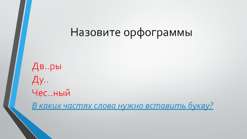 Назовите орфограммыДв..рыДу..Чес..ныйВ каких частях слова нужно вставить букву?