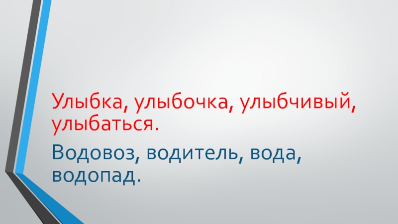 Улыбка, улыбочка, улыбчивый, улыбаться. Водовоз, водитель, вода, водопад.