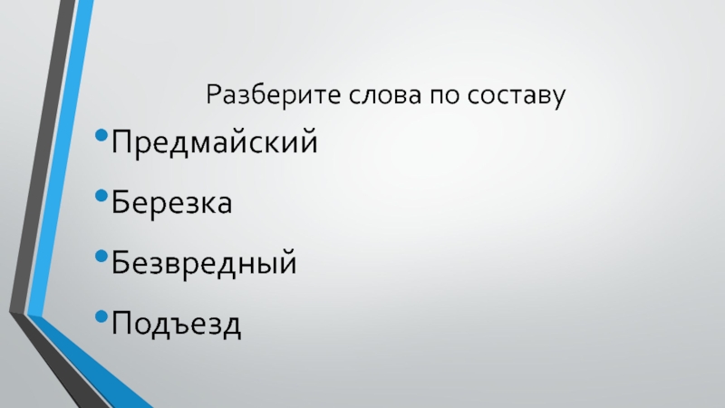 Разберите слова по составуПредмайскийБерезкаБезвредныйПодъезд