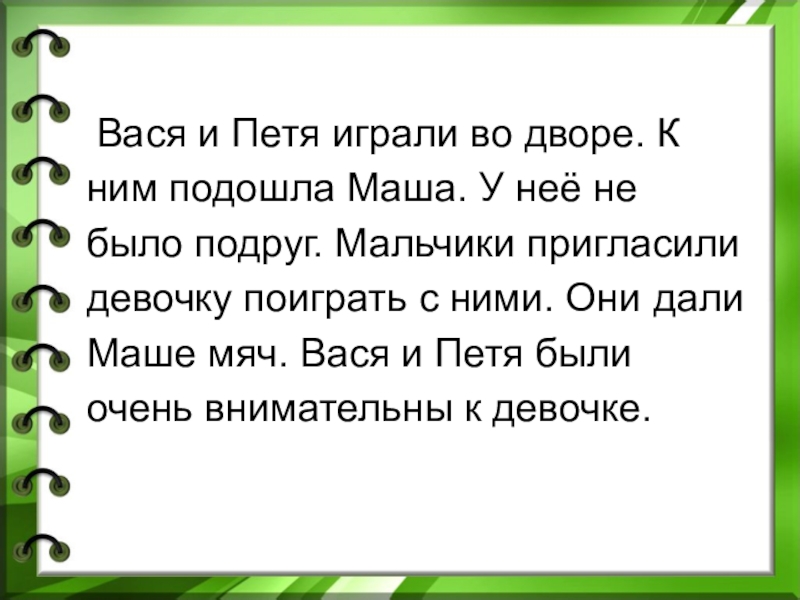 У неё не было подруг. Мальчики пригласили девочку поиграть с ними. Они дали Маше мяч. Вася и Петя были очень внимательны к девочке.