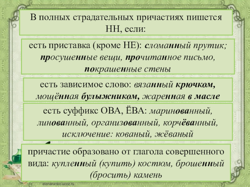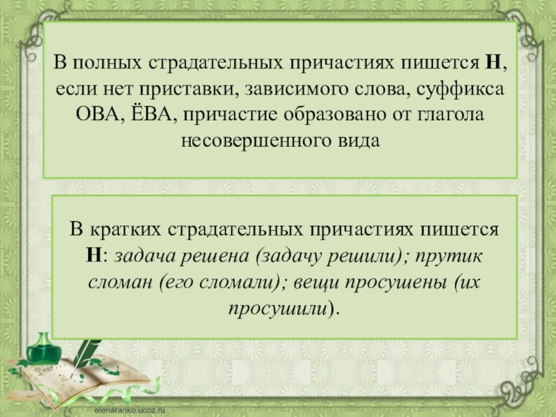 В кратких страдательных причастиях пишется Н: задача решена (задачу решили); прутик сломан (его сломали); вещи просушены (их просушили).