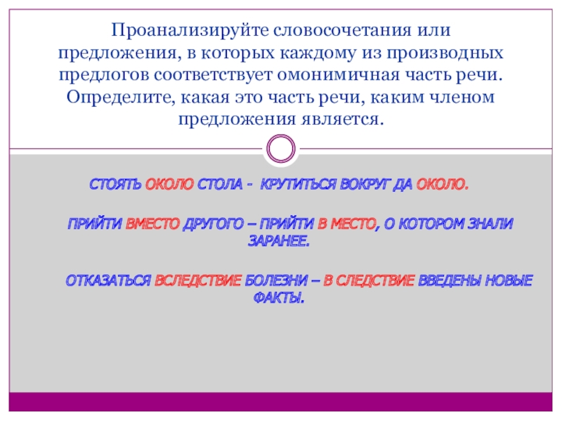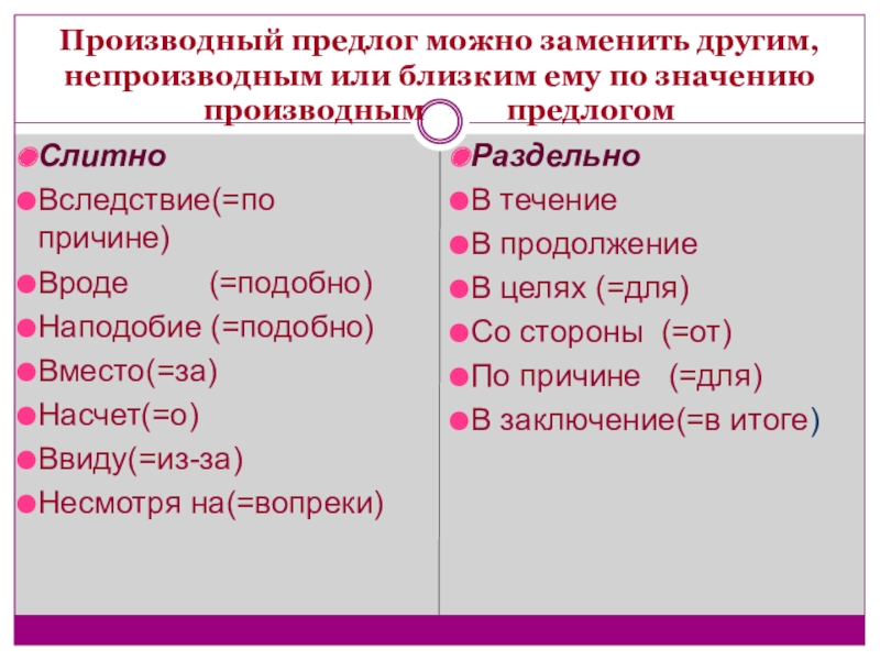 Производный предлог можно заменить другим, непроизводным или близким ему по значению производным предлогом