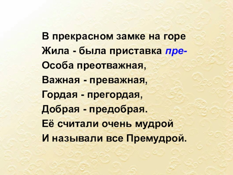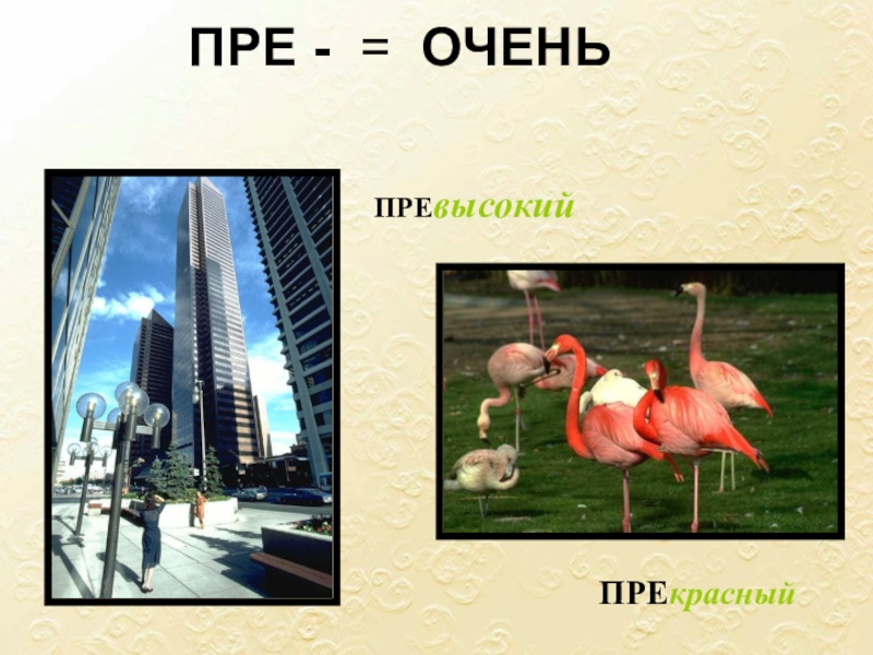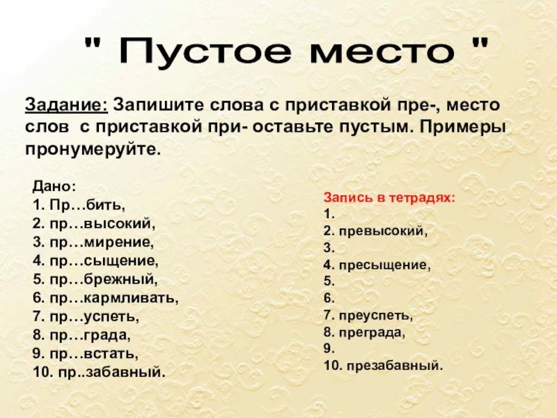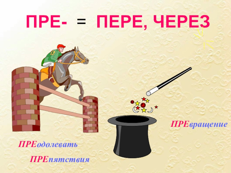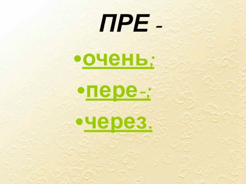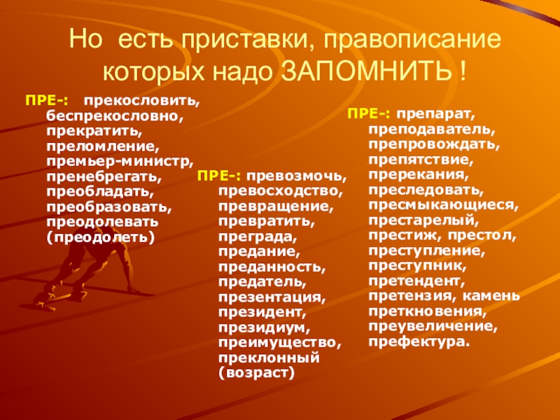 ПРЕ-: превозмочь, превосходство, превращение, превратить, преграда, предание, преданность, предатель, презентация, президент, президиум, преимущество, преклонный (возраст)