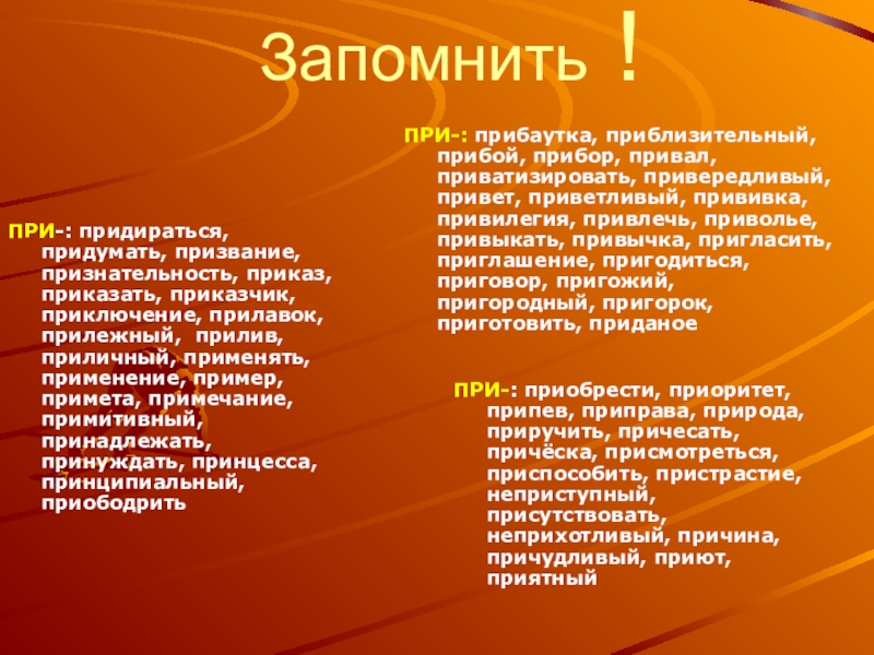 ПРИ-: придираться, придумать, призвание, признательность, приказ, приказать, приказчик, приключение, прилавок, прилежный, прилив, приличный, применять, применение, пример, примета, примечание, примитивный, принадлежать, принуждать, принцесса, принципиальный, приободрить