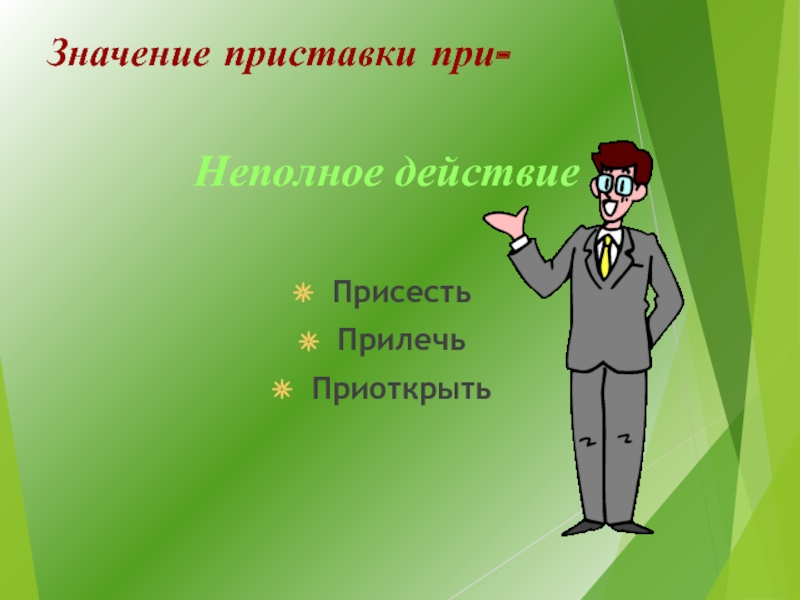 Значение приставки при-Неполное действиеПрисестьПрилечьПриоткрыть