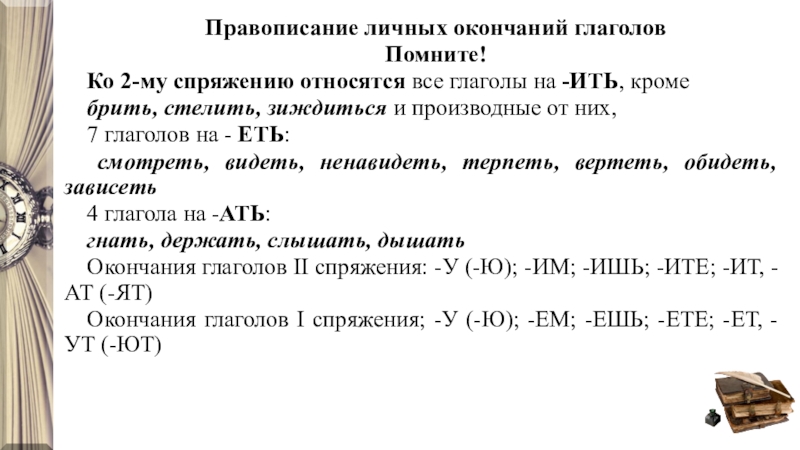 Окончания глаголов II спряжения: -У (-Ю); -ИМ; -ИШЬ; -ИТЕ; -ИТ, -АТ (-ЯТ)