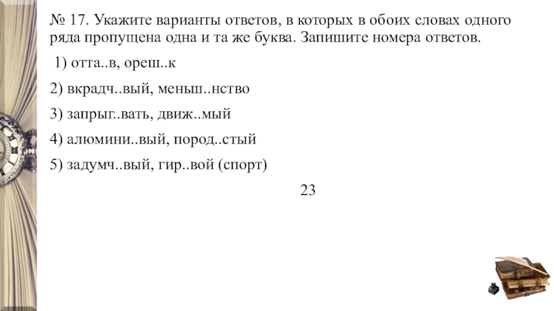 Слайд 28№ 17. Укажите варианты ответов, в которых в обоих словах одного