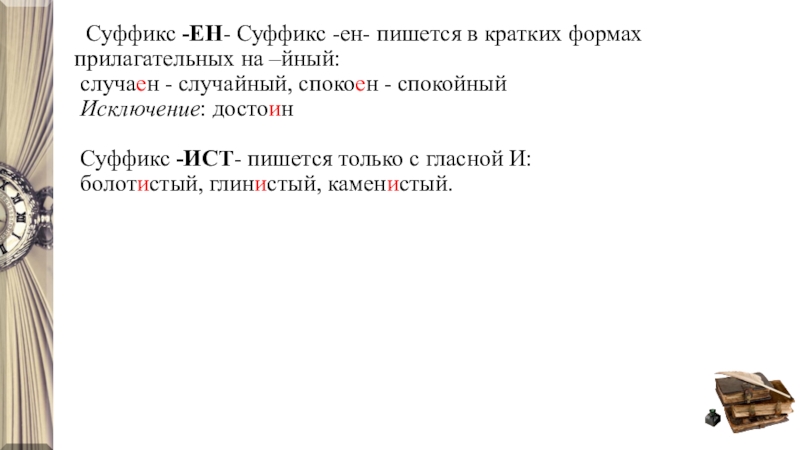 Слайд 7 Суффикс -ЕН- Суффикс -ен- пишется в кратких формах прилагательных на