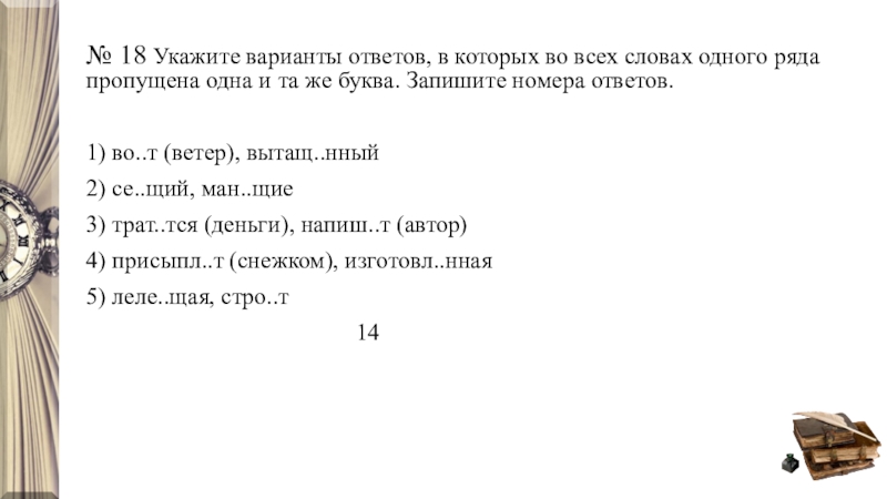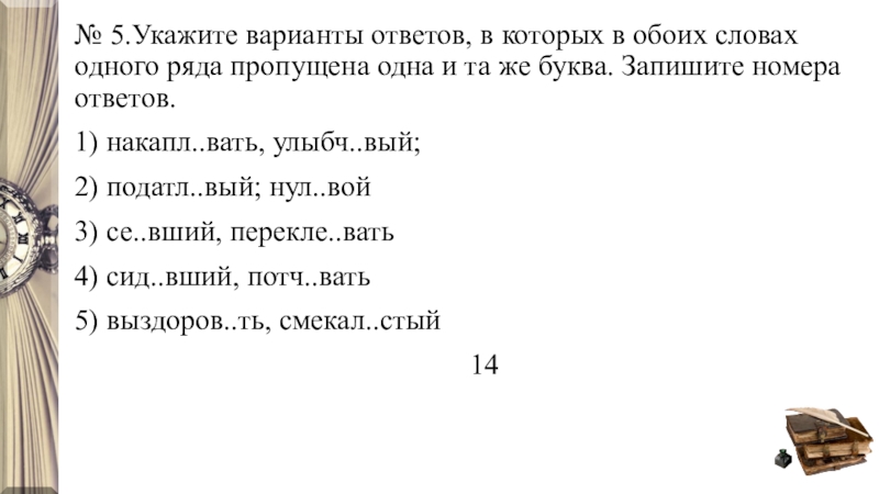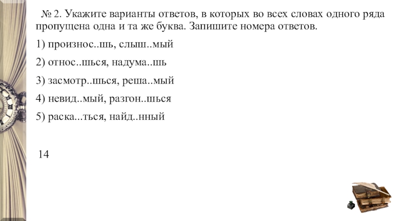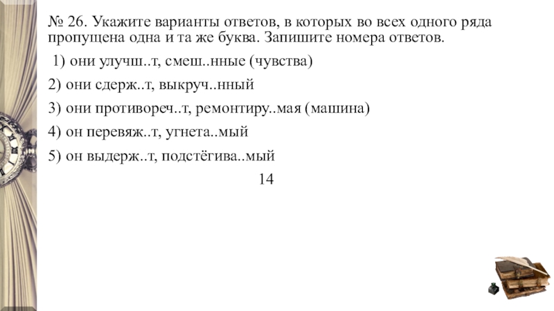Слайд 25№ 14. Укажите варианты ответов, в которых во всех одного ряда