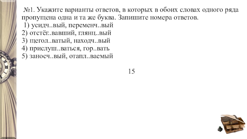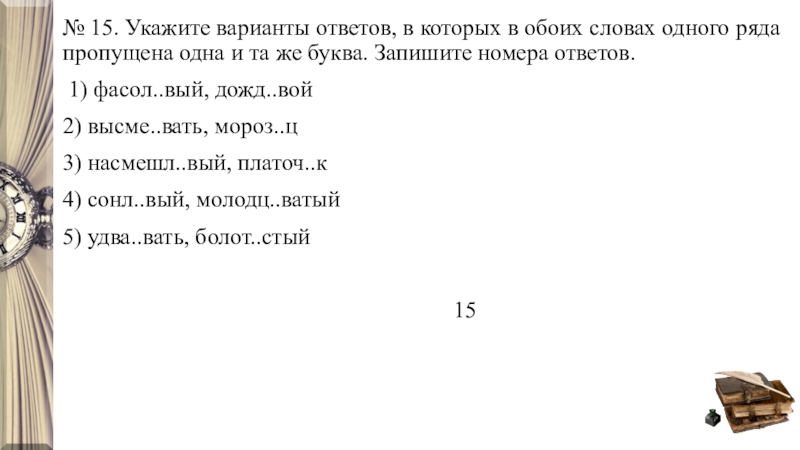 Слайд 26№ 15. Укажите варианты ответов, в которых в обоих словах одного