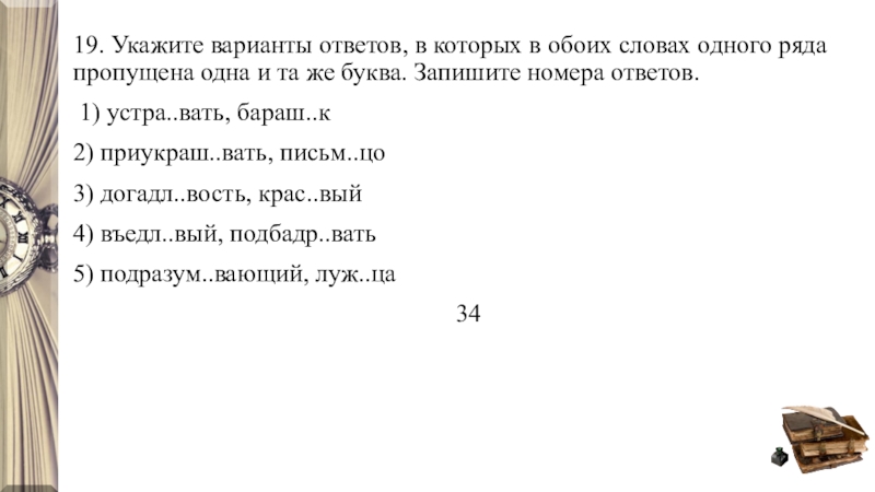 Слайд 3019. Укажите варианты ответов, в которых в обоих словах одного ряда