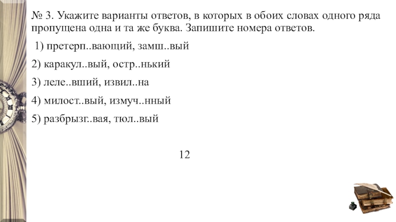 Слайд 23№ 12. Укажите варианты ответов, в которых во всех одного ряда
