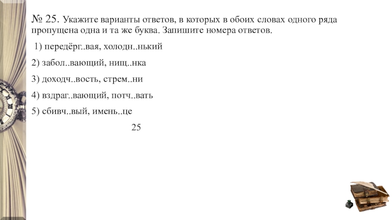 Слайд 36№ 25. Укажите варианты ответов, в которых в обоих словах одного