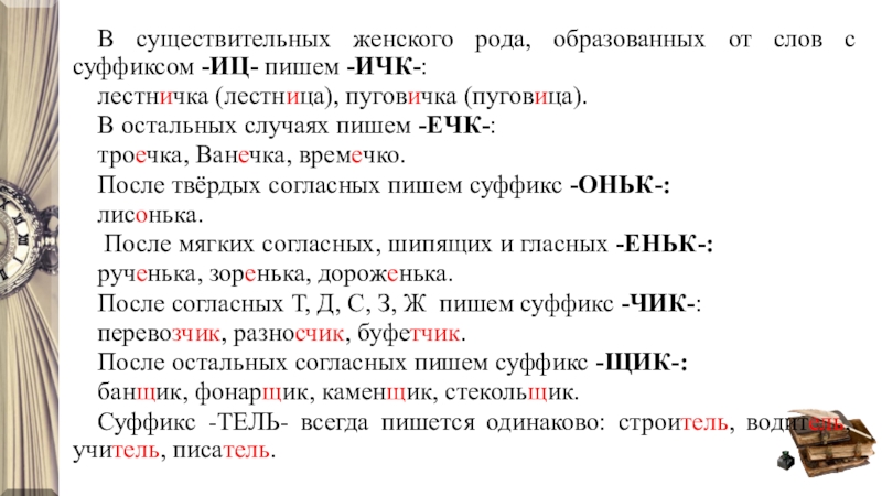 Слайд 9В существительных женского рода, образованных от слов с суффиксом -ИЦ- пишем