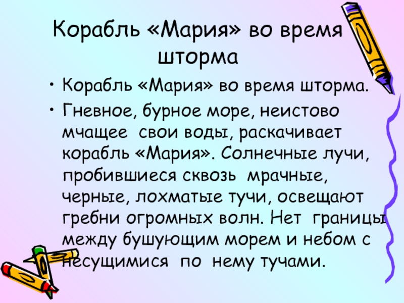 море, неистово мчащее свои воды, раскачивает корабль «Мария». Солнечные лучи, пробившиеся сквозь мрачные, черные, лохматые тучи, освещают гребни огромных волн. Нет границы между бушующим морем и небом с несущимися по нему тучами.
