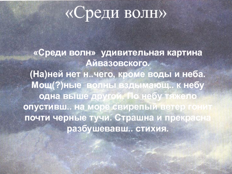 неба. Мощ(?)ные волны вздымающ.. к небу одна выше другой. По небу тяжело опустивш.. на море свирепый ветер гонит почти черные тучи. Страшна и прекрасна разбушевавш.. стихия.