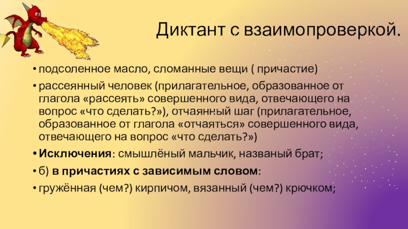 Диктант с взаимопроверкой.подсоленное масло, сломанные вещи ( причастие)рассеянный человек (прилагательное, образованное от глагола «рассеять» совершенного вида, отвечающего