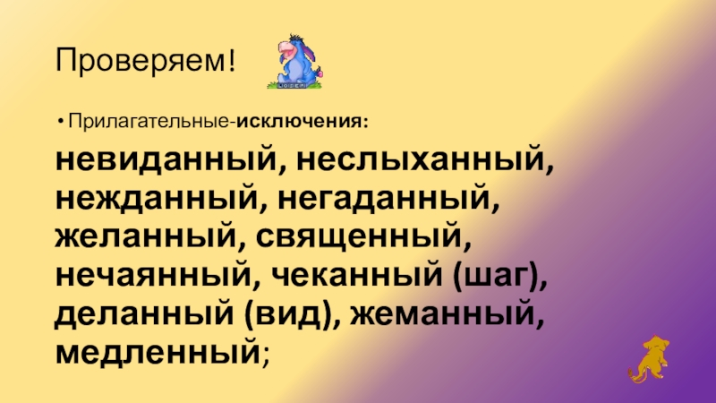 Проверяем!Прилагательные-исключения: невиданный, неслыханный, нежданный, негаданный, желанный, священный, нечаянный, чеканный (шаг), деланный (вид), жеманный, медленный;