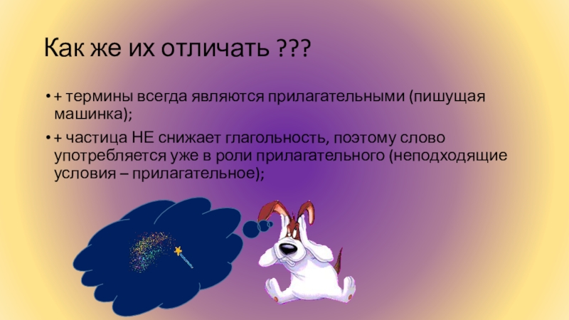 Как же их отличать ???+ термины всегда являются прилагательными (пишущая машинка);+ частица НЕ снижает глагольность, поэтому слово