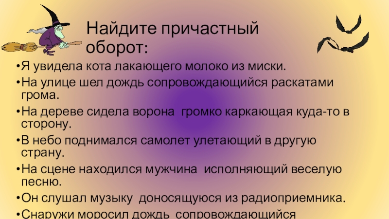 Найдите причастный оборот:Я увидела кота лакающего молоко из миски. На улице шел дождь сопровождающийся раскатами грома. На дереве сидела ворона громко каркающая куда-то в сторону. В небо поднимался самолет улетающий в другую страну. На сцене находился