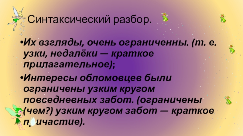 Синтаксический разбор.Их взгляды, очень ограниченны. (т. е. узки, недалёки — краткое прилагательное);Интересы обломовцев были ограничены узким кругом