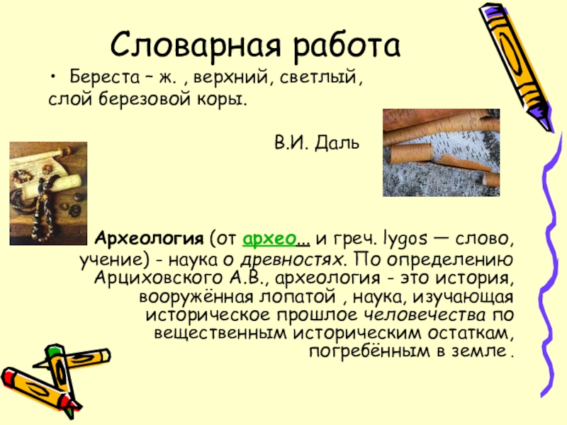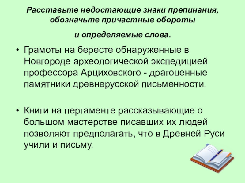 Новгороде археологической эксп..дицией профессора Арциховского - др..г..ценные пам..тники древнерусской письменности. На Руси книги, летописи писались на пергаменте – материале из телячьей кожи. При раскопках нашли и орудия письма – кост..ные, металлические и деревян..ые «писала».