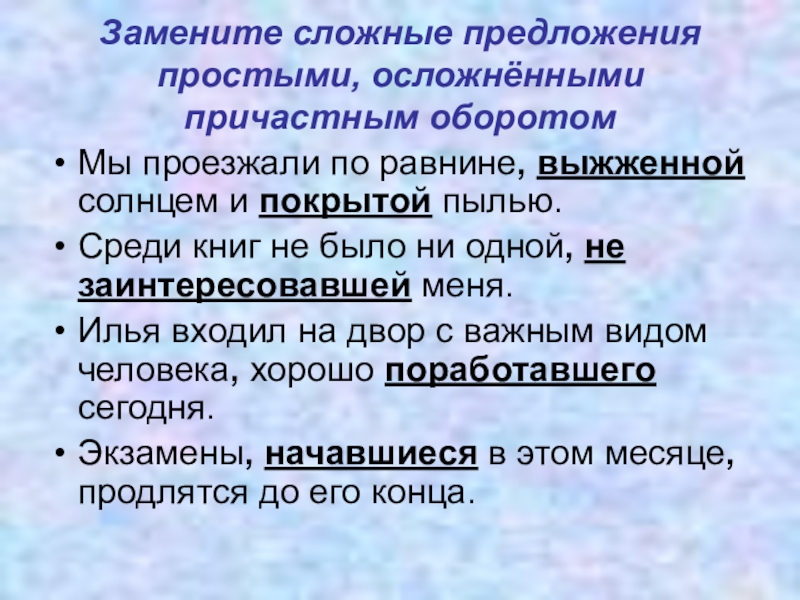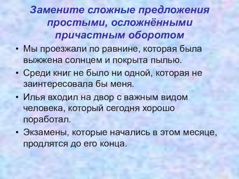Слайд 21Замените сложные предложения простыми, осложнёнными причастным оборотом