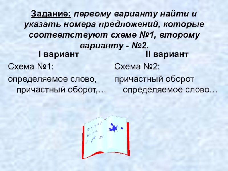 Слайд 13Задание: первому варианту найти и указать номера предложений, которые соответствуют схеме